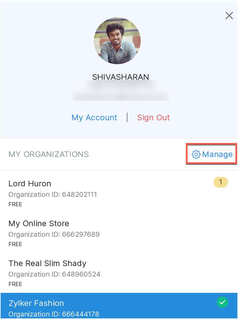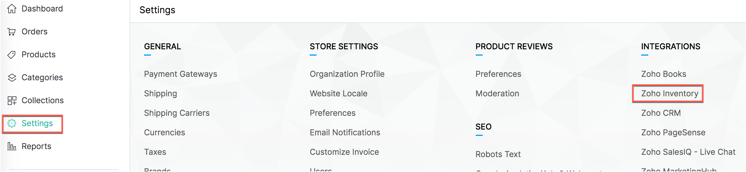 If you're an existing Inventory user, select your organization from Zoho Commerce to get started with your online shop.
